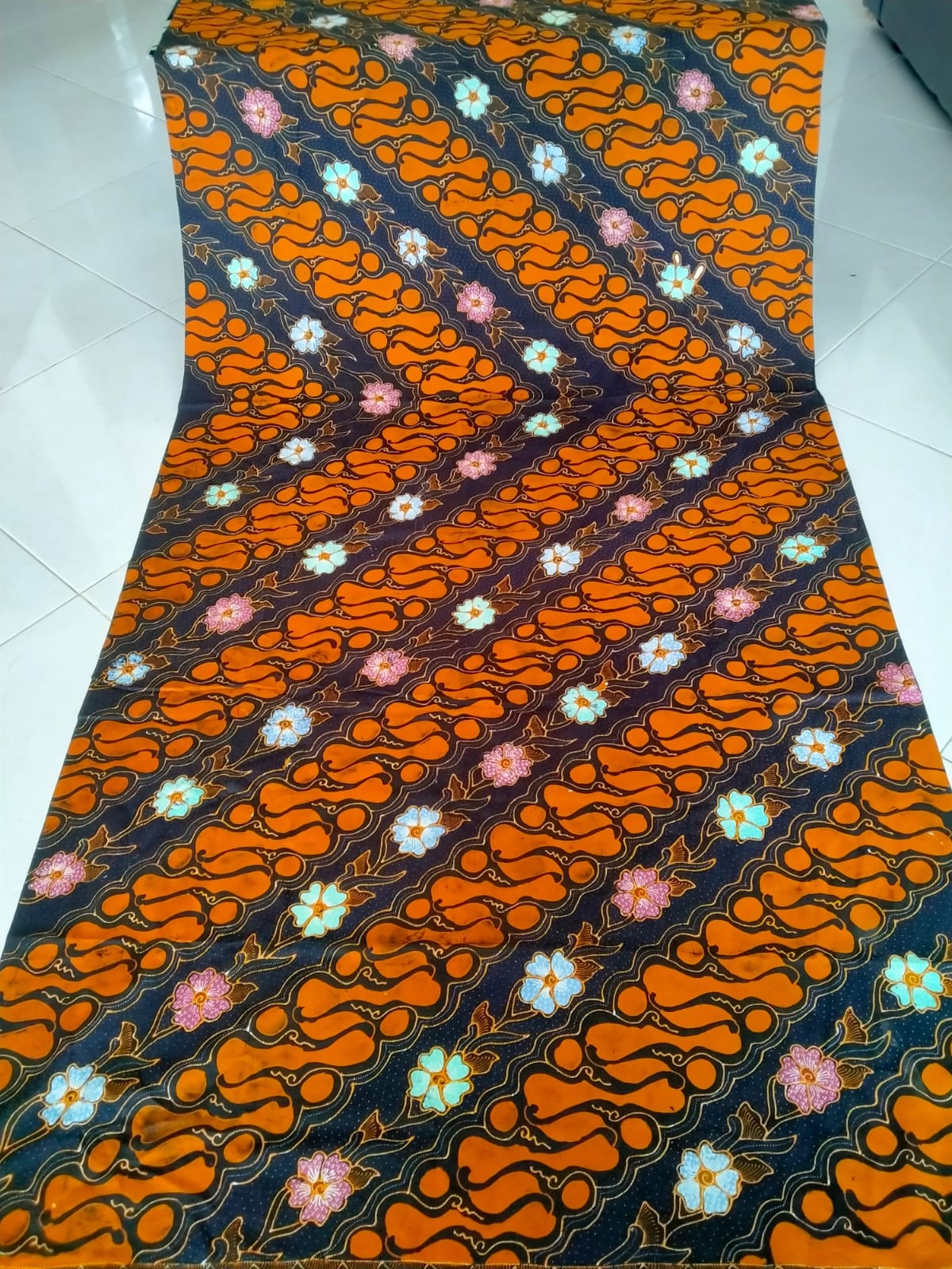 Motif Parang yang bermakna semangat pantang menyerah, dipermanis dengan taburan bunga berwarna cerah yang memberikan kesan dinamis namun tetap tradisional.